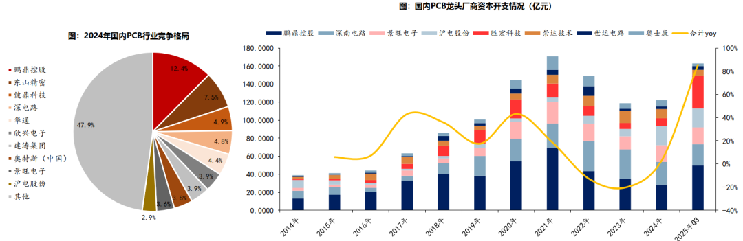 在AI和新能源时代,AIDC 与汽车电子需求如同双引擎,为 PCB 行业注入强劲动力,其中 AIDC 需求的快速增长,让 HDI 板成为高价值 PCB 产品中的最大增量。2025 年前三季度,国内 8 家 PCB 龙头企业合计资本开支达 163 亿元,同比增长 85%,相当于行业集体踩下扩产油门,资本开支节奏明显加速。