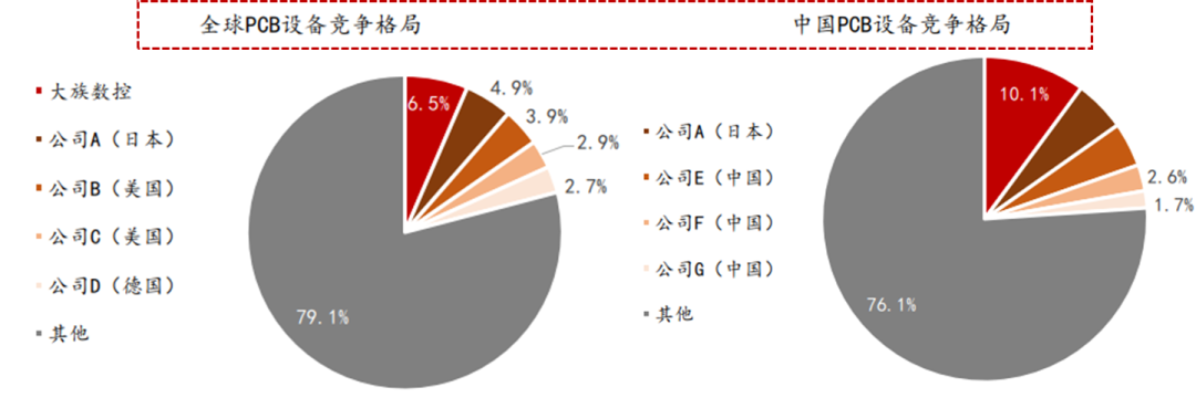 其中大族数控是行业领头羊,在国内 PCB 专用生产设备制造商中排名第一,占据国内约 10.1% 的市场份额(全球 6.5%)。