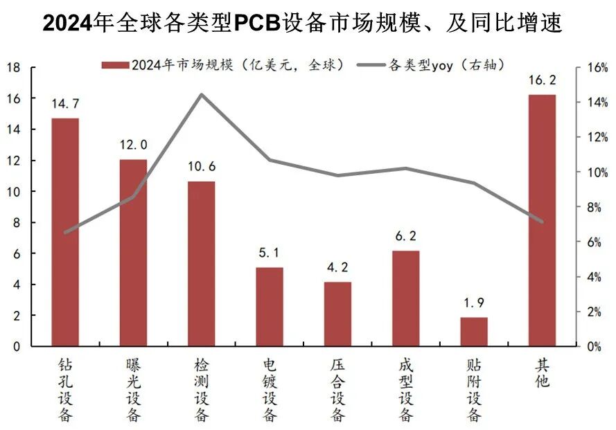 在市场层面,它堪称 PCB 设备赛道的 “价值核心”——2024 年全球市场规模超 100 亿元,中国市场规模近 60 亿元,同比增长约 7%,不仅在 PCB 设备中价值量占比最大,更占据着不可替代的核心地位。