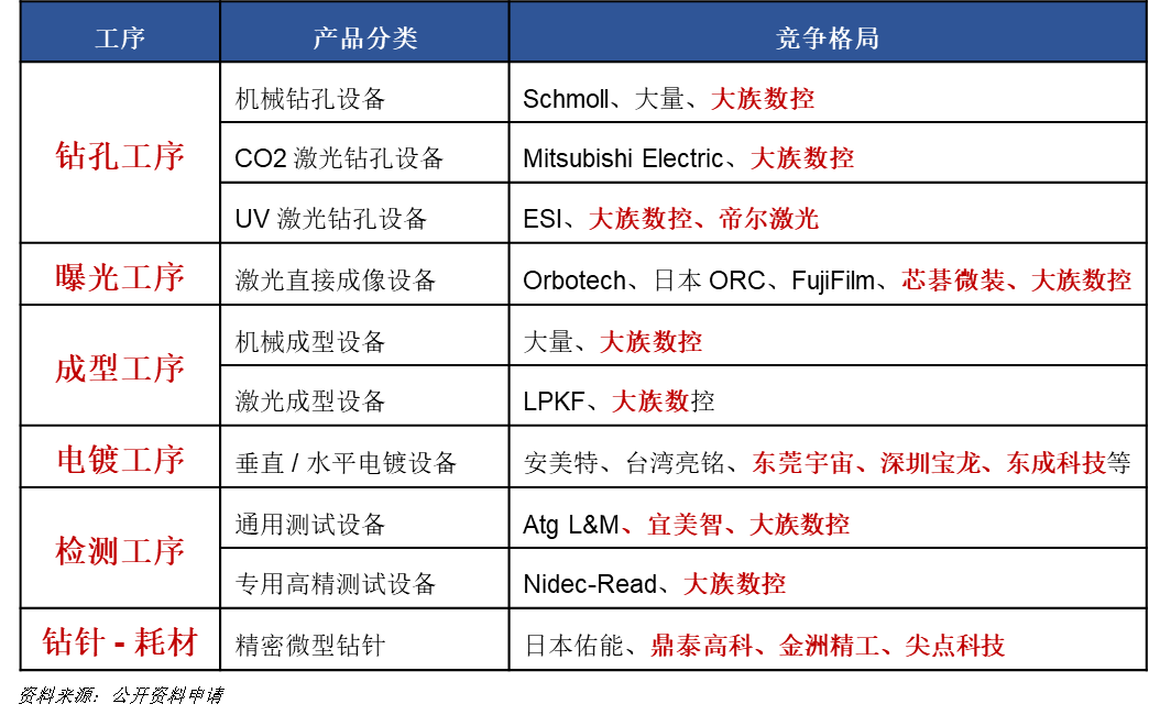 目前高端 PCB 设备国产化率不足 30%,仍有较大进口替代空间,而中国 PCB 设备龙头已在核心环节形成突破 —— 钻孔(大族数控)、光刻(芯碁微装)、电镀(东威科技)、耗材(鼎泰高科)四大领域如同搭建起全球竞争的护城河,已具备国际竞争力。
