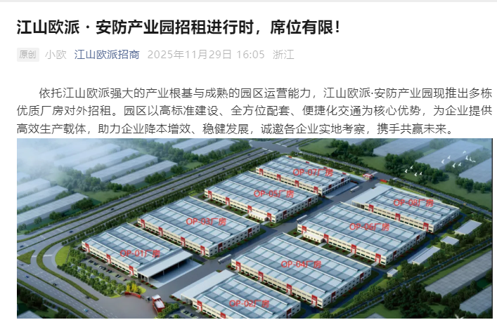 近日,江山欧派门业股份有限公司(简称“江山欧派”)正式启动其位于浙江江山的“江山欧派·安防产业园”厂房招租计划。此举被视为该公司在10月底宣布关停河南、重庆两家全资子公司,并将业务全面回迁至浙江总部基地后,对释放出的成熟工业产能与高标准厂房资源进行市场化盘活的关键一步。