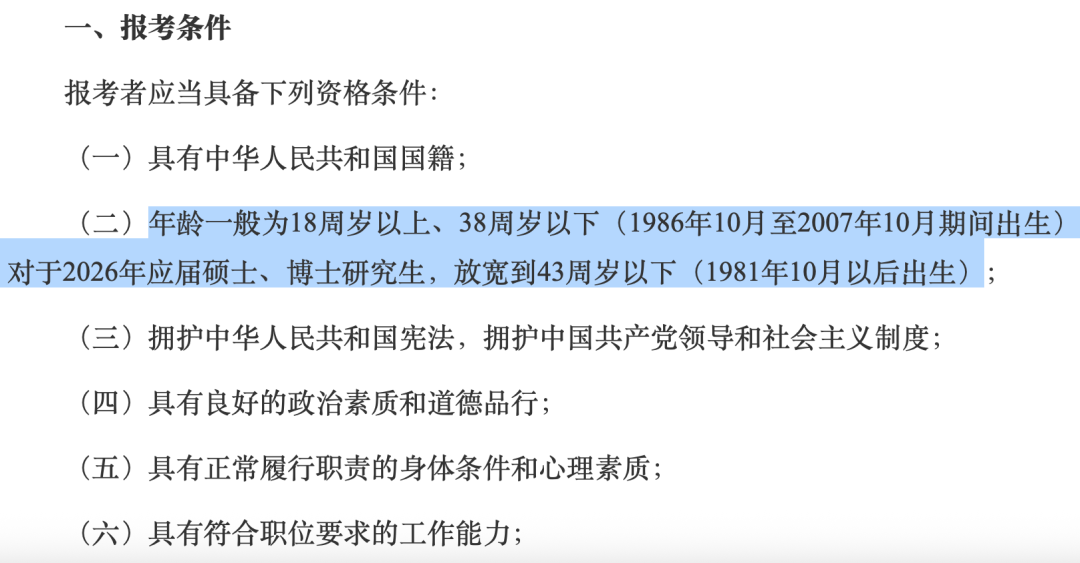 与此同时,《2026年度考试录用公务员公告》进一步放宽年龄限制,报考上限从35岁提高到38岁,研究生群体可放宽到43岁。这意味着,未来两年考公人数还可能持续走高。