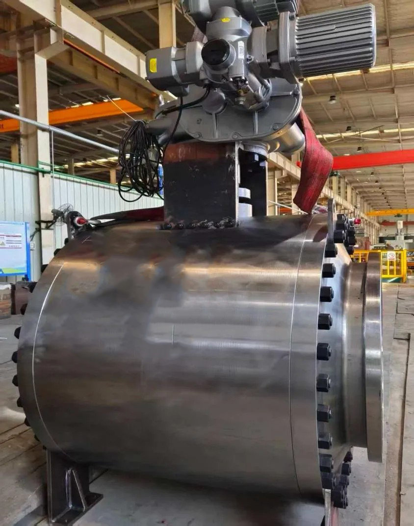 此批36英寸口径球阀高2.5米,自重逾12吨,其庞大的体积与重量对设计、制造及检验能力均提出较高要求,尤其是电动执行机构对扭矩精度控制极为严格。球蝶工厂充分发挥协同优势,从前期策划到最终出厂,全程统筹设计、加工、装配、测试各环节,全员聚力攻坚,有效解决了阀门制造中的多项技术难题,有力保障了该重型产品的顺利完工。