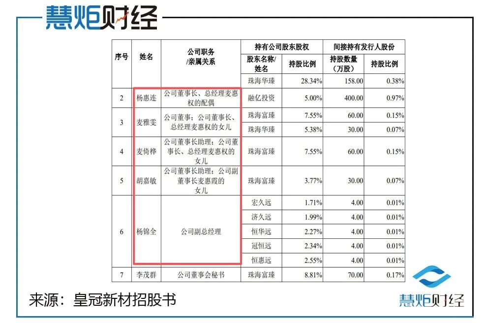 除了麦惠权、麦惠霞外,二人的诸多亲属要么直接现身皇冠新材的股东名单中,要么直接在皇冠新材担任要职。