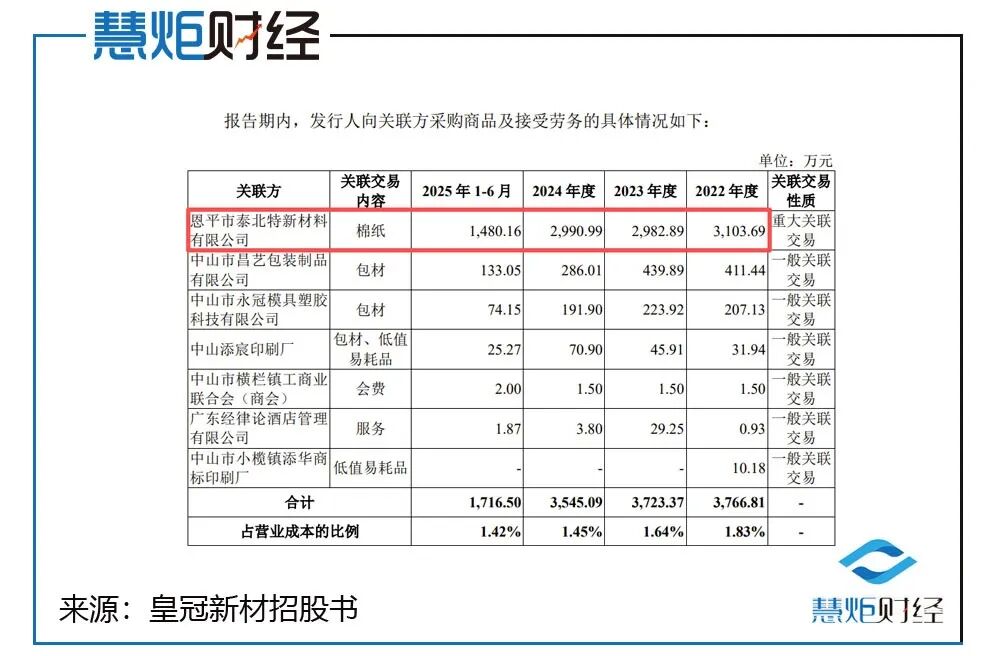 此外,皇冠新材报告期内与关联方恩平市泰北特新材料有限公司(下称:泰北特新材)的关联交易极为密切,大量棉纸采购来自泰北特新材。
