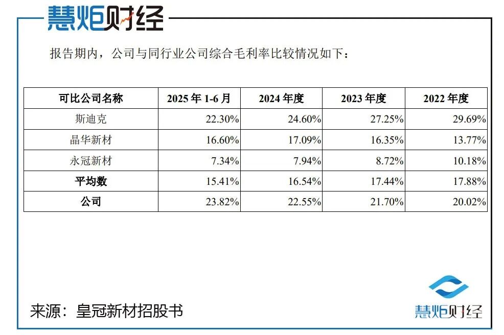 据皇冠新材招股书数据显示,2022年至2025年上半年,其综合毛利率分别达到了20.02%、21.70%、22.55%、23.82%。