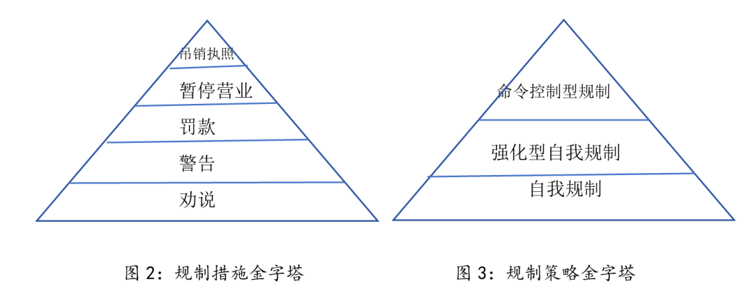 立足道德性、协商性,回应性监管理论发展出过责相当、手段和目的统一的规制系统。该理论认为,公私混合的规制体系会比单纯使用政府管制或完全依靠市场调节取得更好的效果。要根据不同的产业结构、市场主体的动机和自我规制的能力以及不同的时机,而采用不同程度的干预和不同的规制措施,此即针锋相对法(tit-for-tat)。作者把回应性规制方法概括和描述为 “金字塔” 理论,包括 “规制措施金字塔” 和 “规制策略金字塔”。多数的政府措施应该是位于 “强制金字塔” 底端的教育、说服,再根据情况而升级到警告、罚款、暂停营业乃至于最严厉的吊销执照。从策略角度,政府首先应该鼓励行业自我规制,当自我规制达不到预期效果时,政府将采用强化型自我规制(enforced self regulation),比如企业根据自己的情况来制定规则,但要接受政府的审批和监督(合规机制),如果这种强化型自我规制还不能奏效的话,政府就会采取传统的命令控制型规制。²⁴这种措施、策略所形成的管制体系有很强的针对性、适应性,因为其考虑到了博弈过程形成和维护合作的成本收益问题以及个人或企业的复杂动机:双方都先采取合作的姿态,直到有一方背弃了这种合作关系,另一方再采用惩罚的报复手段,从而使双方又回到合作的态势并重建合作型关系。