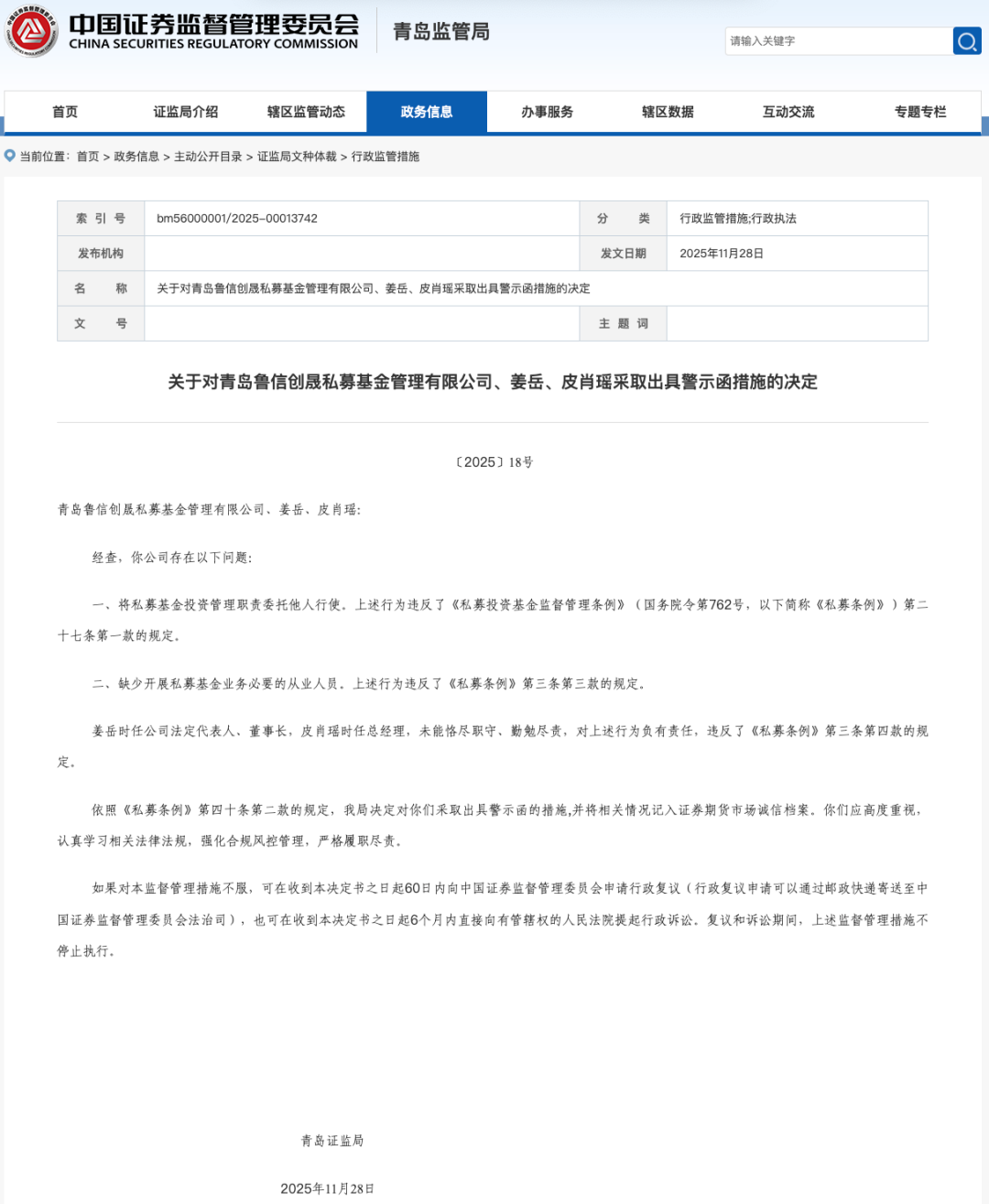 《青岛资本圈》了解到,近日,青岛证监局正式发布〔2025〕18 号决定书,对青岛鲁信创晟私募基金管理有限公司及其时任法定代表人、董事长姜岳,时任总经理皮肖瑶采取出具警示函的监管措施。这一监管行动犹如一声警钟,打破了这家背靠上市公司的私募机构表面的平静。