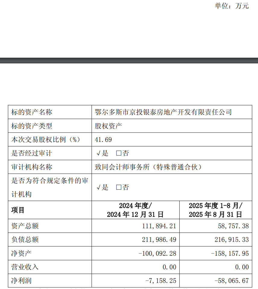 截至评估基准日2025年8月31日,经北京天健兴业资产评估有限公司评估,鄂尔多斯公司净资产为-15.82亿元,股东全部权益评估价值为-15.88亿元。截至本公告披露日,鄂尔多斯公司正常存续经营。