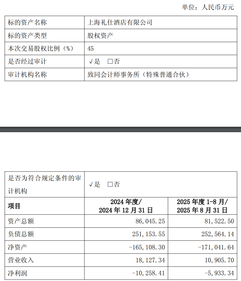 据公告,公司拟以0元收购Trillion Full持有的上海礼仕酒店有限公司(以下简称“上海礼仕”)45%股权,同时拟以3500万元收购复地(集团)股份有限公司(通过Topflighter Limited间接持有Trillion Full股份)对上海礼仕的债权(截至评估基准日2025年8月31日对应的债权本金及利息合计人民币2.09亿元),该债权收购后形成标的公司对公司的债务。本次交易完成后,公司将持有上海礼仕100%的股权,上海礼仕将成为公司全资子公司,纳入公司合并报表范围。