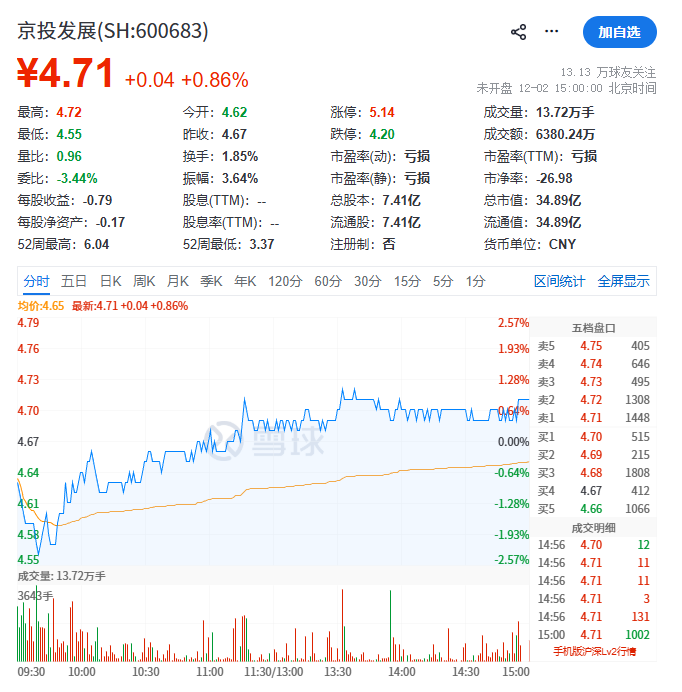 二级市场上,截至12月2日收盘,京投发展涨0.86%,报4.71元/股,总市值34.89亿元。