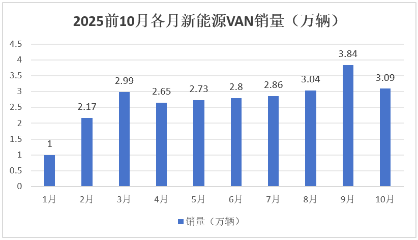 根据最新终端上牌数据,2025年10月国内新能源VAN销售3.09万辆,创史上月度第二高,同比增长16.5%,环比下降19.6%。2025年1~10月国内新能源VAN车型累计销售27.17万辆,同比增长24.6%,比1~9月增幅收窄了近1.1个百分点。