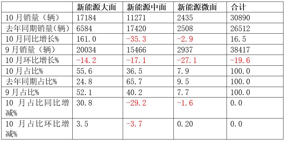 表1,根据终端上牌数据,按车型长度及装载容积划分,2025年10月新能源VAN车型中的大面、中面和微面销量、同环比及占比统计如下: