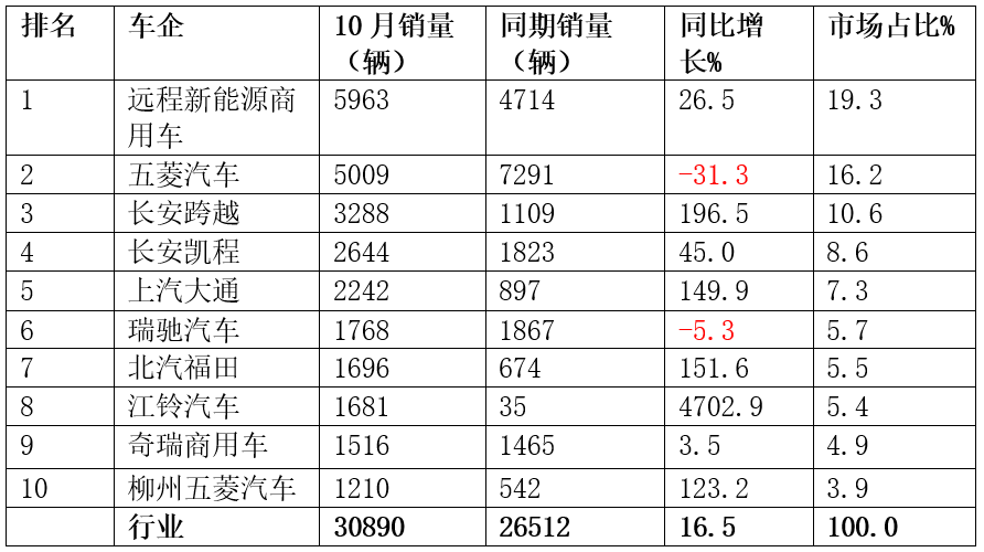 表3,2025年10月新能源VAN市场Top10车企销量同比及市场占比统计(数据来源:终端上牌)
