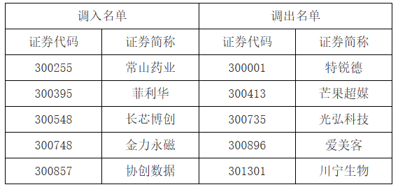创业板50指数本次更换5只样本,常山药业、菲利华、长芯博创、金力永磁、协创数据调入指数样本,特锐德、芒果超媒、光弘科技、爱美客、川宁生物调出指数样本: