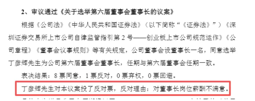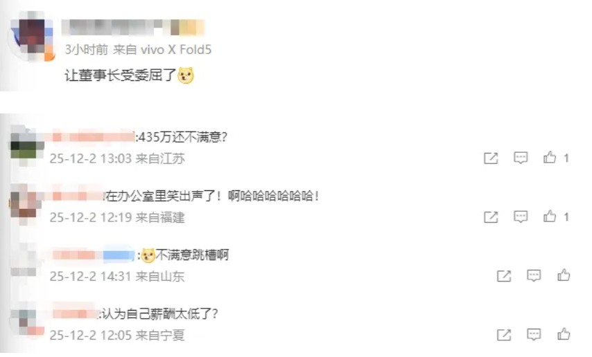 出人意料的是,这唯一的反对票正是来自丁彦辉本人,公告中明确其反对理由为 “对董事长岗位薪酬不满意”。这一消息曝光后迅速在社交平台发酵,有网友调侃 “让董事长受委屈了”,也有不少网友直言 “435 万还不满意?”,质疑声与调侃声交织。