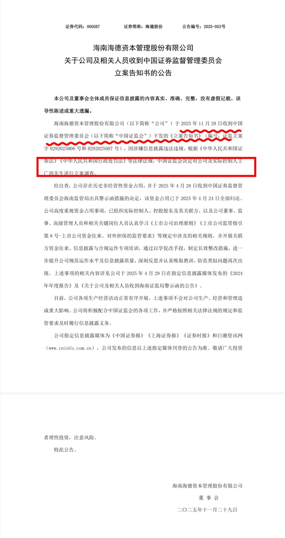 事件的核心是一笔高达8.84亿元的资金占用。海南证监局在2025年4月出具的警示函显示,海德股份在开展债权投资及困境资产收购业务时,资金被控股股东或其关联方占用。