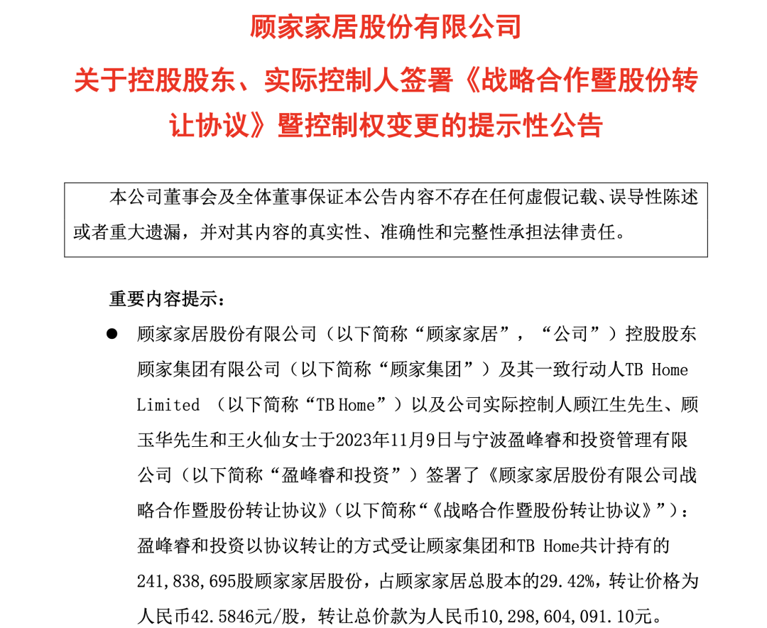 2023年11月,顾氏家族将顾家家居29.42%的控股权,以88.8亿元的成交价价,彻底转让给了由美的集团“少东家”何剑锋控制的盈峰睿和投资。2024年,顾江生辞去董事长职务,黯然离场。那个梦想着让“顾家”走向世界的家族,最终在资本狂飙的末路上,失去了“顾家”本身。 门店依旧灯火通明,销售数字依然庞大,但这一切,已与顾氏三代人的创业传奇再无瓜葛。