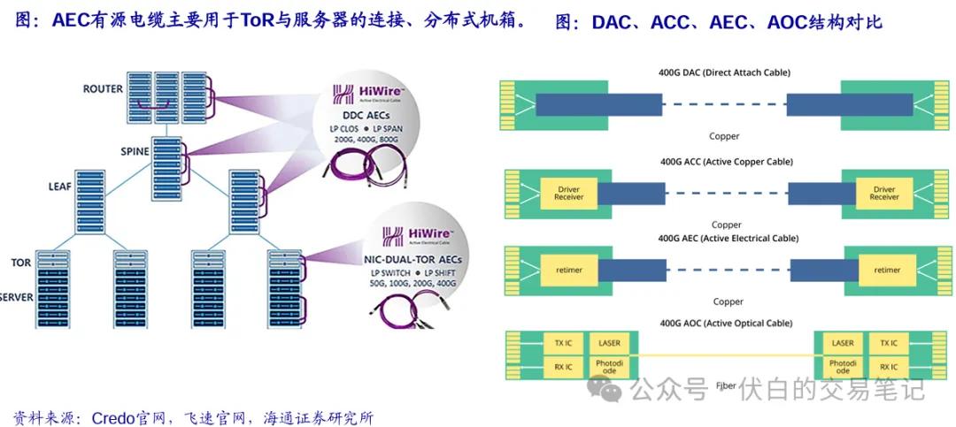 (3)应用场景:AEC弥补了DAC与AOC之间的距离差距,可满足机柜内部、TOR与后端网络、机架间连接等场景。