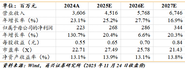 基于公司在电网领域的深度深耕、非电战略行业的成功拓展及电商与海外业务的突破性进展,咸亨国际已建立起多级增长引擎,我们看好其持续受益于国内MRO市场由传统零散采购向集约化采购过渡发展趋势及公司自身技术和服务能力构建的竞争壁垒。我们预计公司2025-2027年营业收入分别为45.16/57.68/67.46亿元,同比增速分别为25.2%/27.7%/16.9%;毛利率略微下降,预计分别为26.1%/24.6%/24.8%;归母净利润分别为2.68/2.86/3.44亿元,同比增速分别为20.4%/6.6%/20.3%;预计2025-2027年EPS分别为0.65/0.70/0.84元,对应PE分别为27.49/25.78/21.43倍(对应2025年11月24日收盘价);咸亨国际作为国内领先的MRO集约化服务领军者,成长路径清晰,新业务拓展与技术壁垒构筑或将驱动盈利能力修复,首次覆盖,给予“买入”评级。