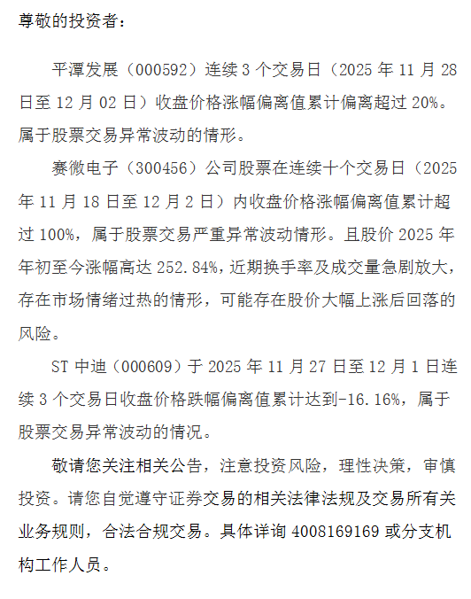 【风险提示】关于平潭发展、赛微电子、 ST中迪交易风险提示公告