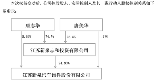 本次权益变动后,唐志华直接持有公司股份4432.41万股,占公司总股本的8.69%,通过新泉投资间接持有公司总股本的18.57%,合计持有公司总股本的27.26%;唐美华直接持有公司股份905.37万股,占公司总股本的1.77%,通过新泉投资间接持有公司总股本的6.36%,合计持有公司总股本的8.13%。