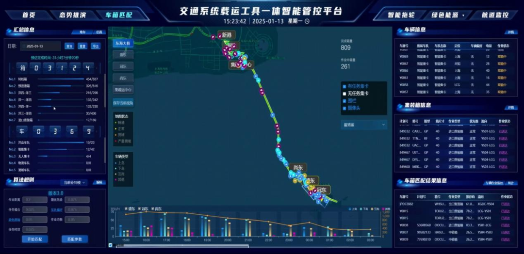 系统已在上海港应用,日均调度任务超2.7万次,年服务业务超218万标箱,集卡重载率提升17%,整体作业效率提升13.3%,形成了可复制、可推广的智慧绿色港口物流范式。成果已成功应用于上海洋山、外高桥两大核心港区。核心技术推广至秘鲁钱凯港,具备国际化复制推广潜力,为“一带一路”沿线港口智慧化升级提供支撑。