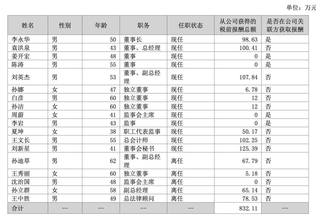 2024年年报显示,公司董事、监事和高级管理人员2024年报酬总额832.11万元。董事长李永华2024年从公司获得的税前报酬总额为98.63万元,在公司关联方获取报酬。董事、总经理袁洪泉2024年从公司获得的税前报酬总额为100.41万元,未在公司关联方获取报酬。董事会秘书刘新星2024年从公司获得的税前报酬总额为125.39万元,未在公司关联方获取报酬。