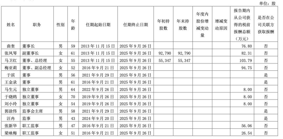2024年年报显示,公司董事、监事和高级管理人员2024年报酬总额633.30万元。董事长曲奎2024年从公司获得的税前报酬总额为76.8万元。董事、总经理马卫红2024年从公司获得的税前报酬总额为103.79万元,董事会秘书李宝生2024年从公司获得的税前报酬总额为35.44万元,以上人员均未在公司关联方获取报酬。