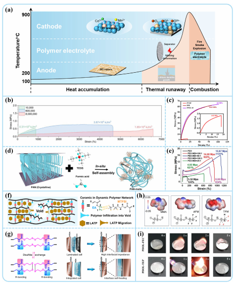 图6:本征安全性提升。通过“增强机械-自修复-阻燃”三段式设计,演示高分子量、无机3D骨架、动态氢键/二硫键自愈合及含氟/含磷阻燃剂对热失控起始温度>135 °C、针刺温升<40 °C 的关键作用。