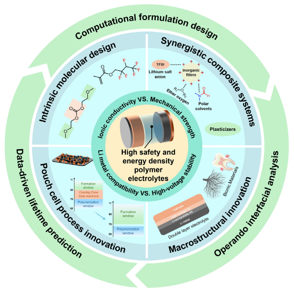 在这篇文章中,作者系统梳理了在HVLMBs中有效实施PEs的多维度策略,涵盖分子设计、材料制备、界面工程等各个环节,尤其关注电解质的制备工艺及其聚合机理。文章深入探讨了理论模拟、先进材料/界面工程与可扩展制造之间的协同路径,并重点介绍了在材料层面提升PE基HVLMBs机械完整性和阻燃性的创新方案。本文分享的思考与见解,有望弥合理论与实验研究之间的鸿沟,加速聚合物电解质高压锂金属电池在未来能源版图中的实用化与高性能化进程。