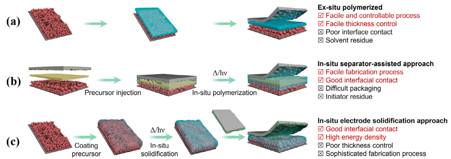 图1:PE 制备路线图。对比“先固化后组装”的ex situ溶液浇铸与“先浸润后固化”的in-situ隔膜辅助/电极固化两种工艺,指出后者可显著降低固-固界面阻抗,但需解决溢胶、均厚化等工程难题。