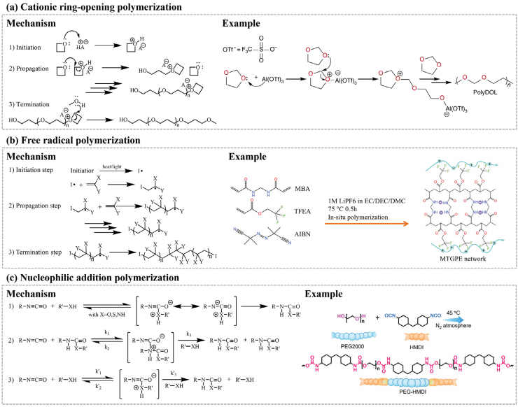 图2:三种原位聚合机理。分别示意阳离子开环(CROP)、自由基加成与亲核加成的引发-增长-终止过程,阐明CROP对醚类单体温和可控,自由基体系易实现光/热开关,亲核加成适合构建聚氨酯但需严格脱水。