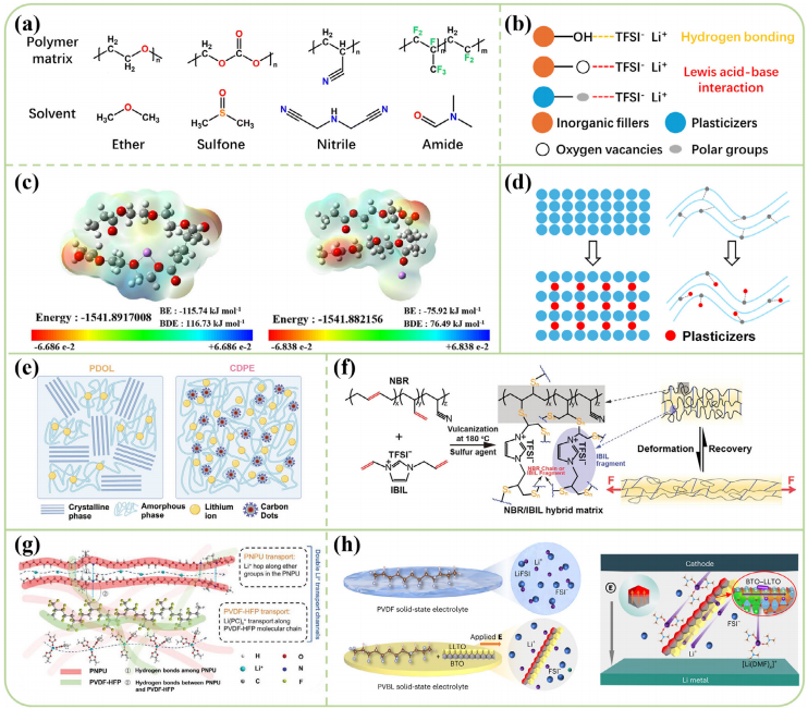 图4:提高离子电导率途径。围绕“增自由Li+浓度”和“促链段运动”两大核心,列举极性基团、Lewis酸填料、降Tg增塑、破坏结晶共聚、取向氢键及活性无机双相通道等8种手段,实现室温电导率由0.2增至8.2×10-4 S cm-1。