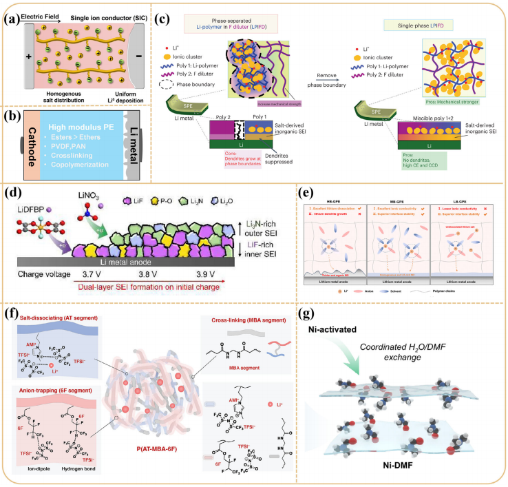 图5:锂负极相容性方案。提出“均化离子流-提升模量-构建致密SEI”三管齐下,展示单离子导体、高模交联网络、LiF-rich双层界面及DMF分子捕获等实例,使临界电流密度提高至3.7 mA cm-2且枝晶被完全抑制。