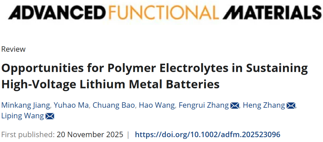 2025年11月20日,电子科技大学王丽平、华中科技大学张恒、天目湖先进储能技术研究院有限公司张凤蕊在国际知名期刊Advanced Functional Materials发表题为《Opportunities for Polymer Electrolytes in Sustaining High-Voltage Lithium Metal Batteries》的研究论文,Minkang Jiang为论文第一作者,王丽平、张恒、张凤蕊为论文共同通讯作者。