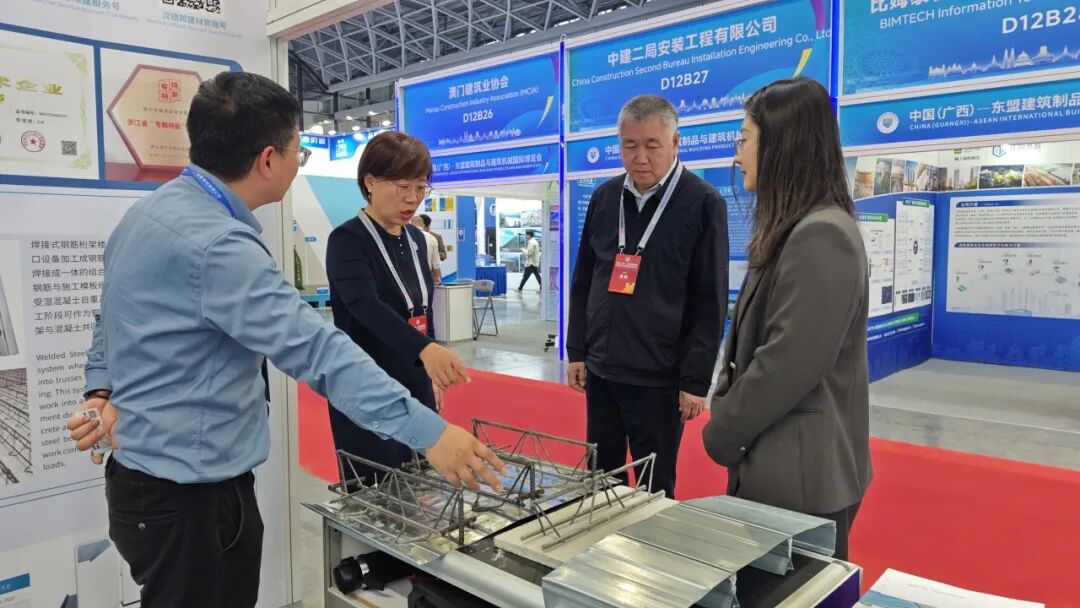 在展位内,杭萧钢构重点展示的焊接式钢筋桁架楼承板(TD板)与免拆底模钢筋桁架楼承板(CTD板)成为关注焦点。TD板属于建筑装配式水平构件,其核心工艺是将楼板钢筋加工成三角形桁架骨架,再与镀锌底模通过电阻焊固定,形成兼具“施工阶段承重模板”与“使用阶段受力构件”双重功能的组合楼承板,能适配不同建筑场景需求,有效缩短施工周期、提高建造效率。CTD板则以创新免拆底模技术为核心,从源头减少施工过程中的建筑垃圾产生,完美契合低碳建筑发展趋势,同时兼具安全可靠、快捷高效的产品优势。