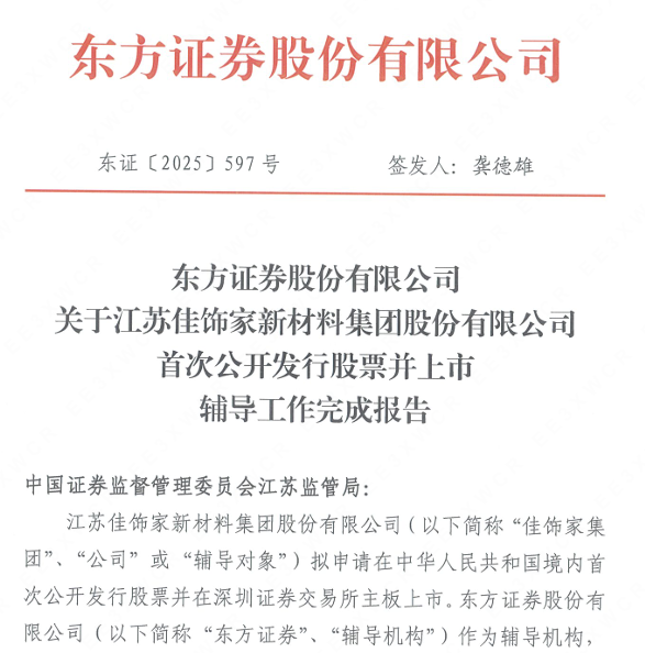 近日,江苏佳饰家新材料集团股份有限公司(以下简称“佳饰家”)披露首次公开发行股票并上市辅导工作完成报告,标志着这家在装饰材料领域深耕多年的“家装隐形冠军”正式向A股资本市场迈出关键一步。