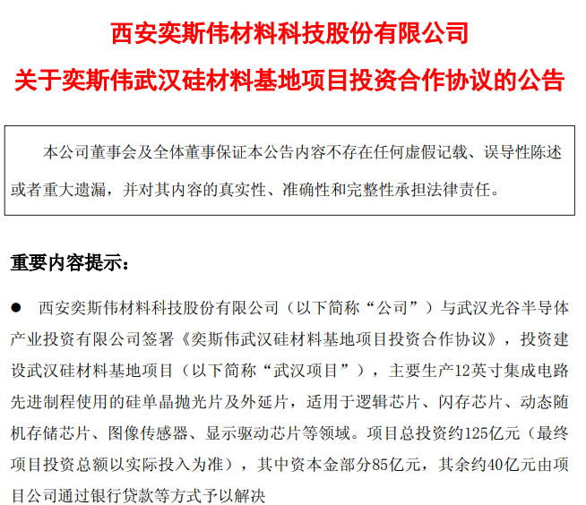 12月2日晚,西安奕材公告披露,公司与武汉光谷半导体产业投资有限公司(下称“光谷半导体产投”)签署《奕斯伟武汉硅材料基地项目投资合作协议》,双方将投资建设武汉硅材料基地项目。该项目主要生产12英寸集成电路先进制程使用的硅单晶抛光片及外延片,适用于逻辑芯片、闪存芯片、动态随机存储芯片、图像传感器、显示驱动芯片等领域。