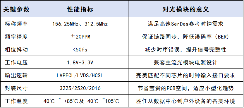 ● 关键性能指标:1.6T光模块需要基于光刻工艺的差分晶振,其关键频点为156.25MHz和312.5MHz。为保障长距离传输下的信号完整性,晶振的相位抖动需低于64飞秒(典型值最好能达到35飞秒级别),频率精度需达到±20ppm以内,并能在-40℃至105℃ 的工业级宽温范围内稳定工作。同时,为适应模块的小型化趋势,需采用2.5x2.0mm或更小的封装。这些高要求直接关系到光模块的传输距离、误码率和信号完整性。