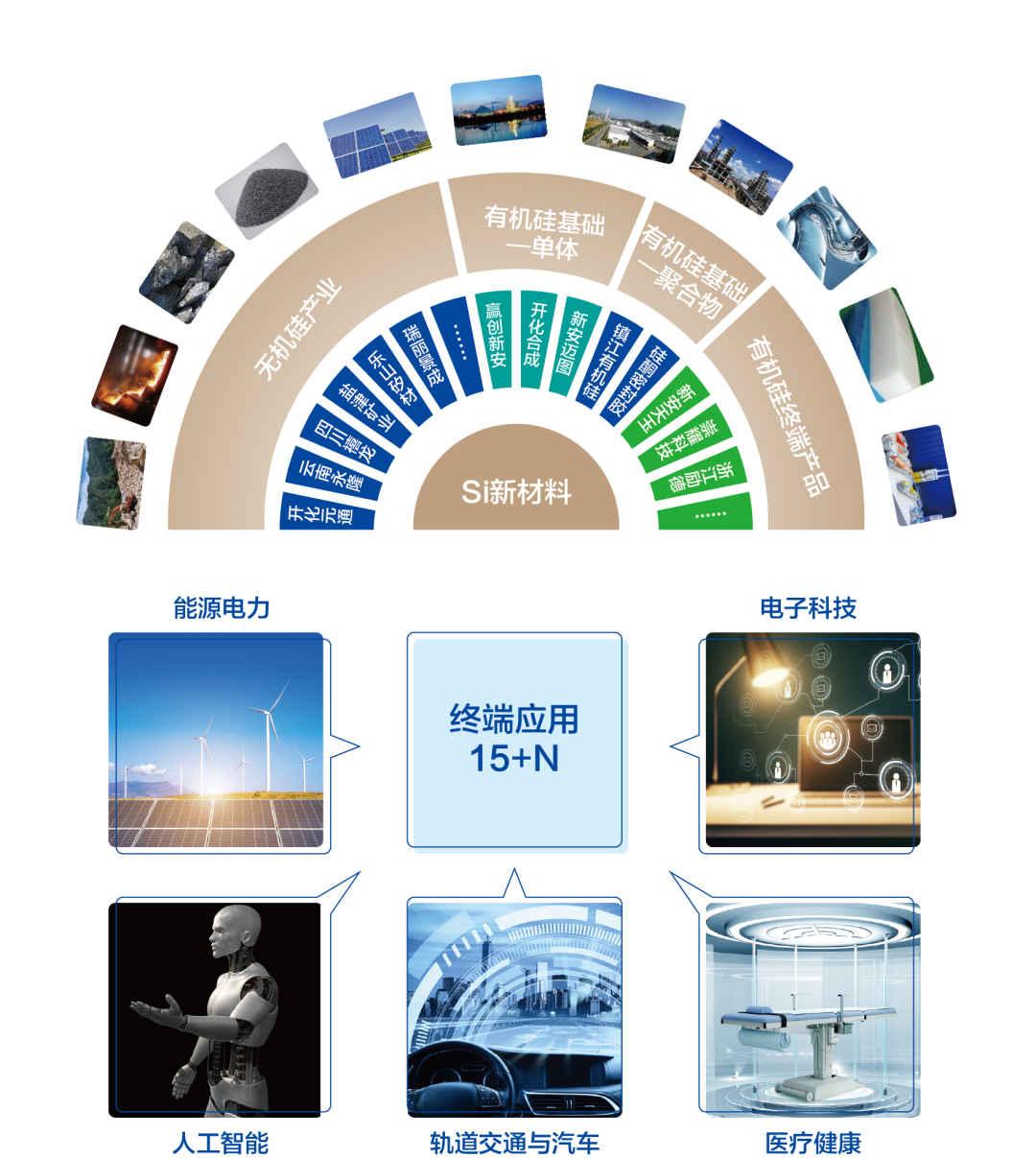 2023年新安入选全球十大有机硅企业,依托硅基新材料全产业链优势,拓展开发AI算力、具身智能、半导体、新能源汽车、航空航天、轨道交通等应用场景解决方案,链接全球战略合作伙伴,构建硅基新材料产业生态圈。