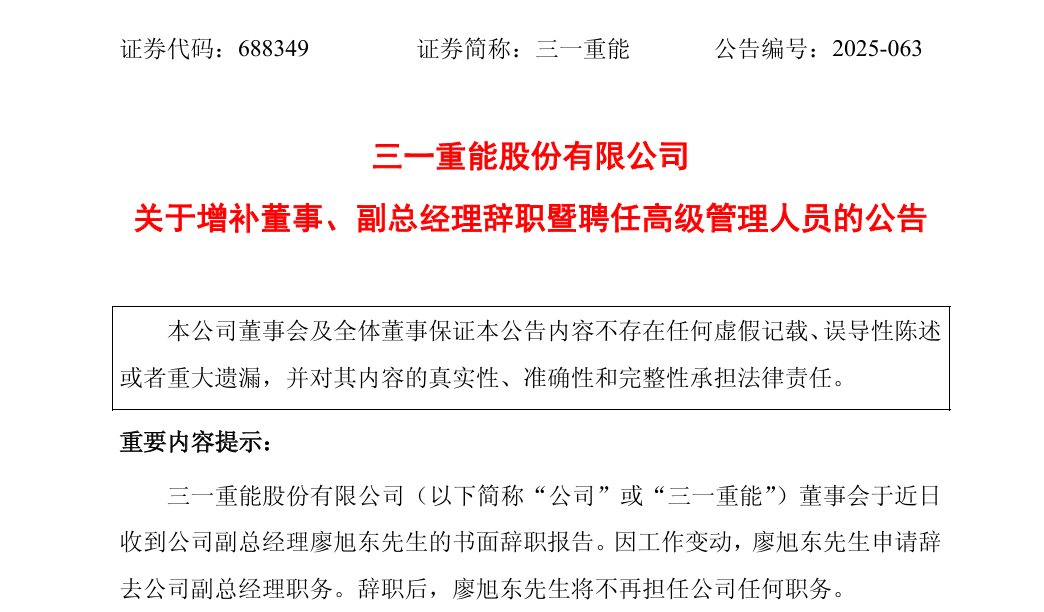 公告披露,三一重能董事会于近日收到公司副总经理廖旭东先生的书面辞职报告。因工作变动,廖旭东先生申请辞去公司副总经理职务。辞职后,廖旭东先生将不再担任公司任何职务。