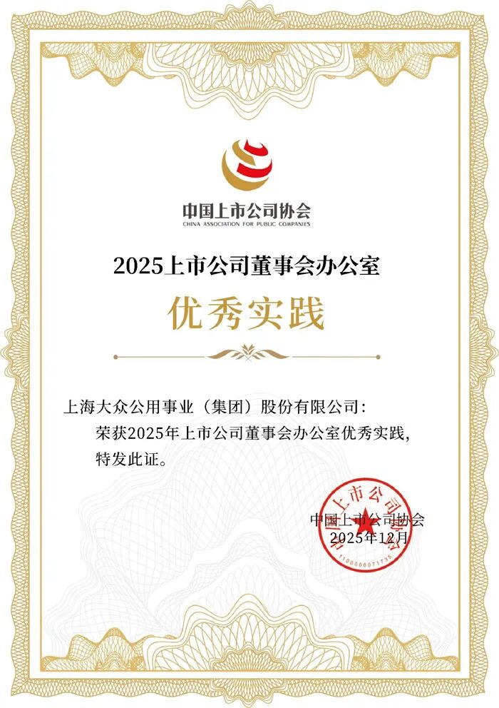 近日,中国上市公司协会公布“2025年上市公司董办最佳实践案例”评选结果。大众公用董事会秘书办公室(下称“董办”)荣获“2025上市公司董事会办公室优秀实践”案例,这是大众公用董办连续四年获此殊荣,充分体现了监管机构及市场对大众公用合规有效的治理机制、持续提升的运作效能、投资者关系管理及信息披露等方面的表现的高度认可。
