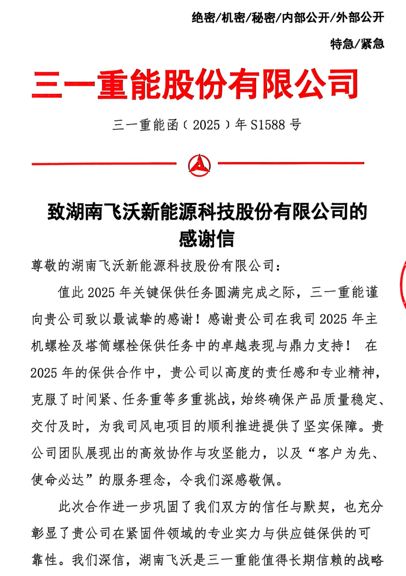 2025年岁末,飞沃科技国内销售部收到一封来自战略合作伙伴——三一重能股份有限公司(简称“三一重能”)的感谢信。作为中国风电行业高端制造标杆企业,三一重能与飞沃科技已携手十载,从稳固供需伙伴进阶为协同共赢的事业同行者。信中,三一重能对飞沃科技在2025年主机及塔筒螺栓保供任务中的卓越表现与鼎力支持致以诚挚谢意,既是对飞沃科技关键交付能力的认可,更是双方深厚合作情谊的生动见证。