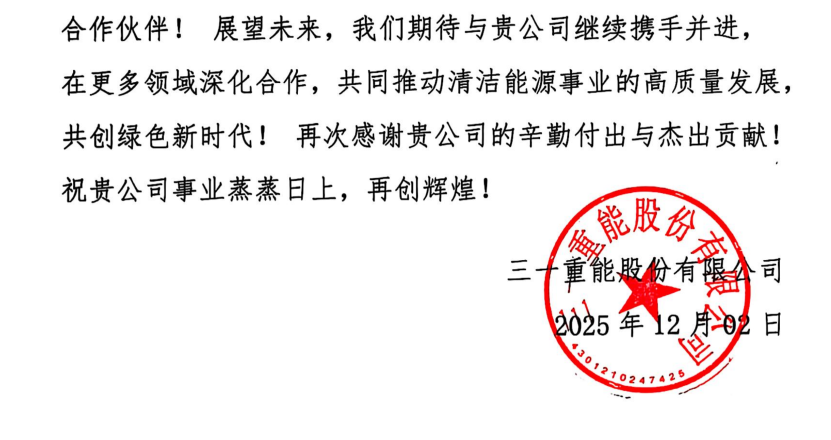 信末,三一重能明确表达深化合作的期待:“我们深信,湖南飞沃是三一重能值得长期信赖的战略合作伙伴!展望未来,期待与贵公司继续携手,拓展合作领域,共推清洁能源事业高质量发展,共创绿色新时代!”