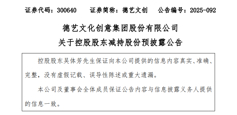 12月4日晚间,德艺文创(300640)公告称,控股股东、实际控制人、董事长吴体芳计划自公告披露之日起15个交易日后的3个月内,通过集中竞价、大宗交易方式减持公司股份不超过621.99万股,占公司总股本的2%。