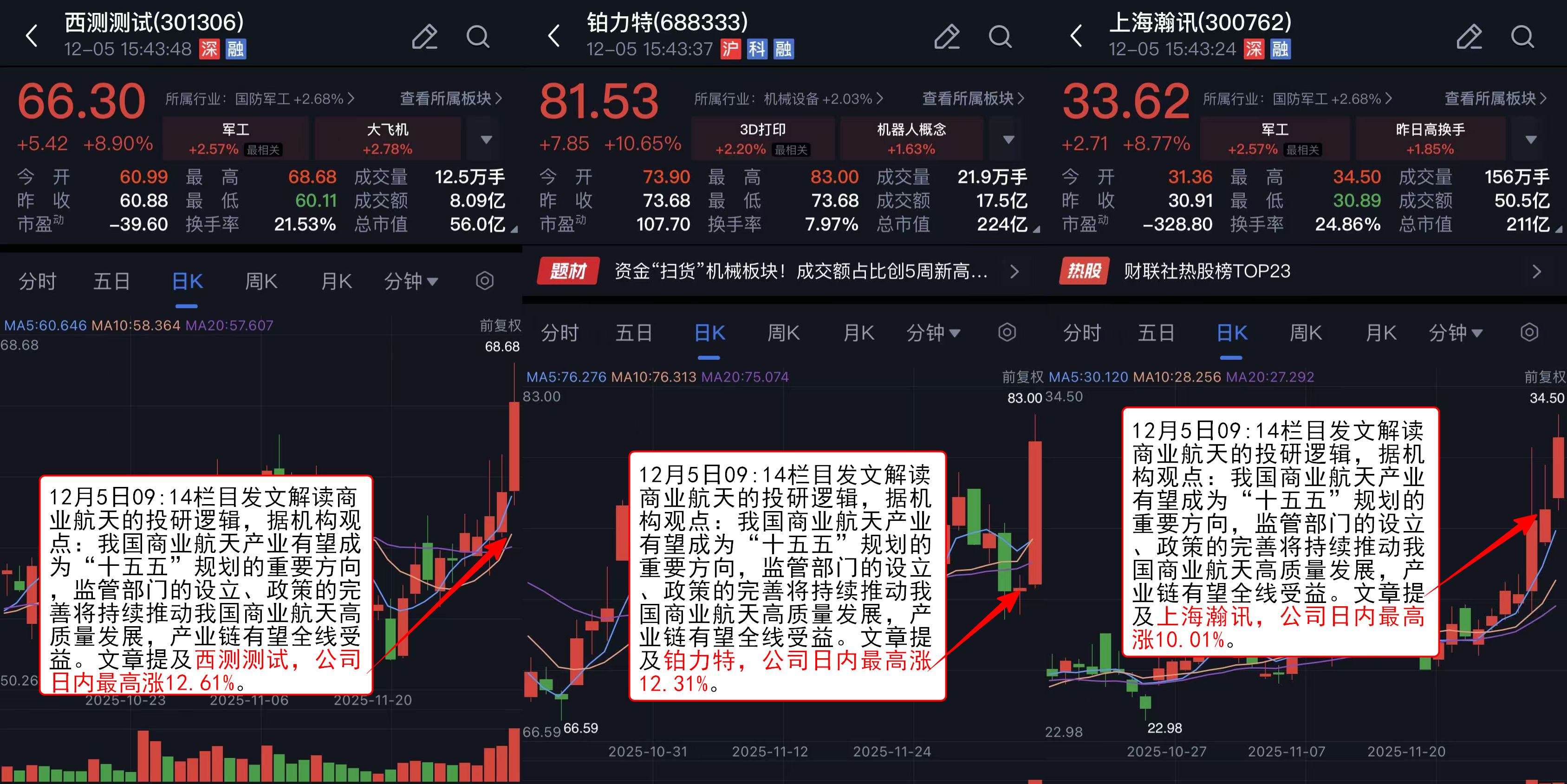 12月5日09:14《盘中宝》发文解读商业航天的投研逻辑,据机构观点:我国商业航天产业有望成为“十五五”规划的重要方向,监管部门的设立、政策的完善将持续推动我国商业航天高质量发展,产业链有望全线受益。文章提及上海瀚讯、铂力特、西测测试在内的多家公司,截至12月5日收盘,上海瀚讯日内最高涨10.01%,铂力特日内最高涨12.31%,西测测试日内最高涨12.61%。