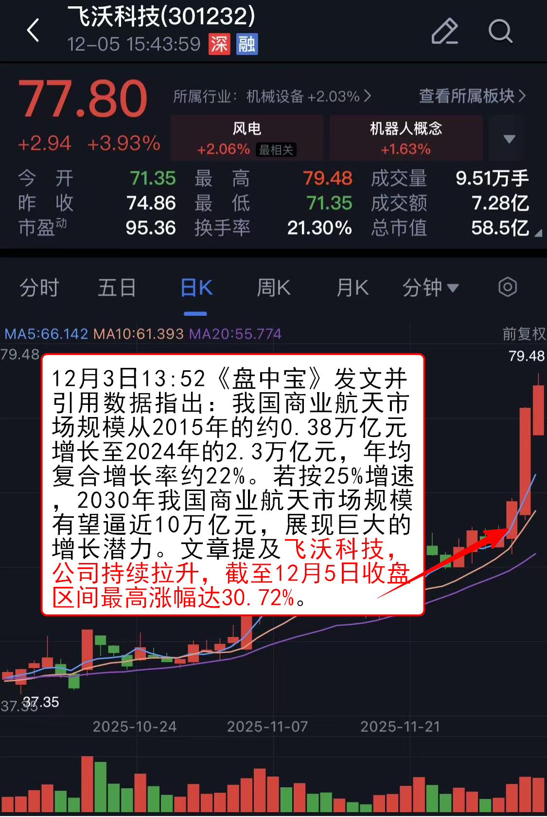 12月3日13:52《盘中宝》发文并引用数据指出:我国商业航天市场规模从2015年的约0.38万亿元增长至2024年的2.3万亿元,年均复合增长率约22%。若按25%增速,2030年我国商业航天市场规模有望逼近10万亿元,展现巨大的增长潜力。文章提及飞沃科技,公司持续拉升,截至12月5日收盘区间最高涨幅达30.72%。
