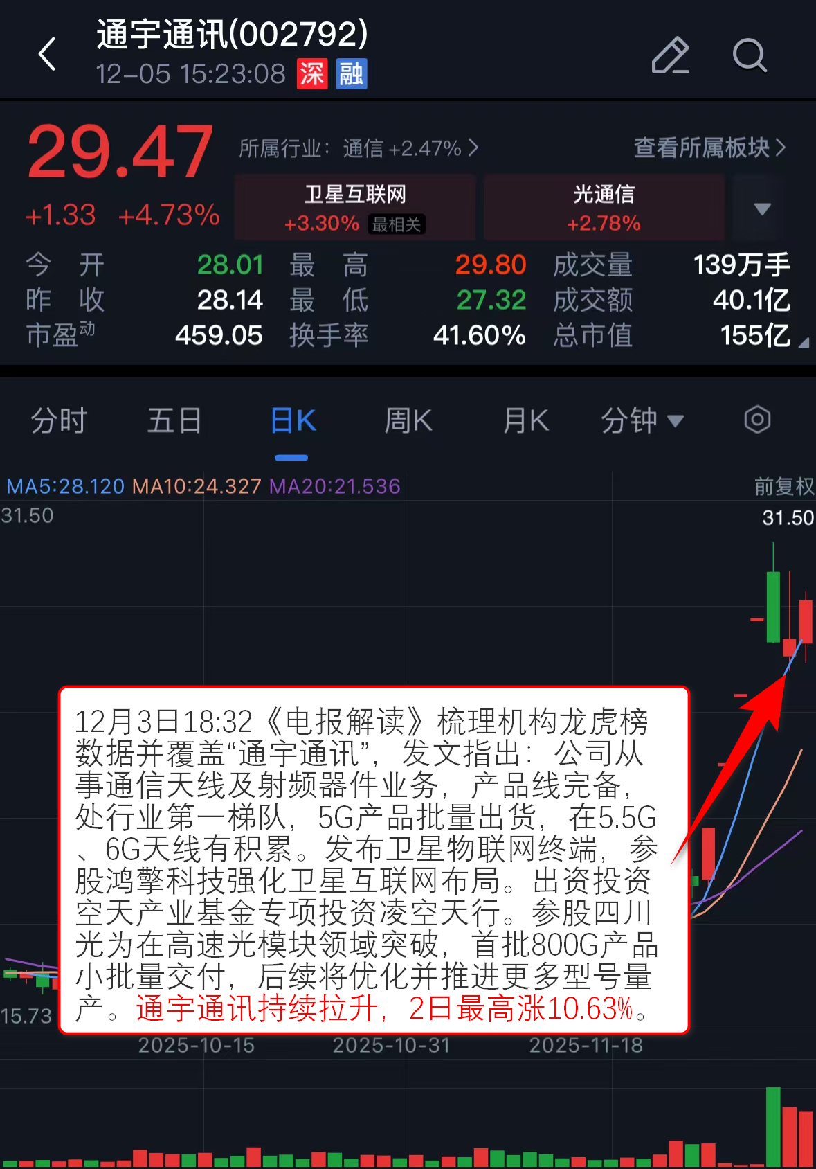 12月3日18:32《电报解读》梳理机构龙虎榜数据并覆盖“通宇通讯”,发文指出:公司从事通信天线及射频器件业务,产品线完备,处行业第一梯队,5G产品批量出货,在5.5G、6G天线有积累。发布卫星物联网终端,参股鸿擎科技强化卫星互联网布局。出资投资空天产业基金专项投资凌空天行。参股四川光为在高速光模块领域突破,首批800G产品小批量交付,后续将优化并推进更多型号量产。通宇通讯持续拉升,2日最高涨10.63%。