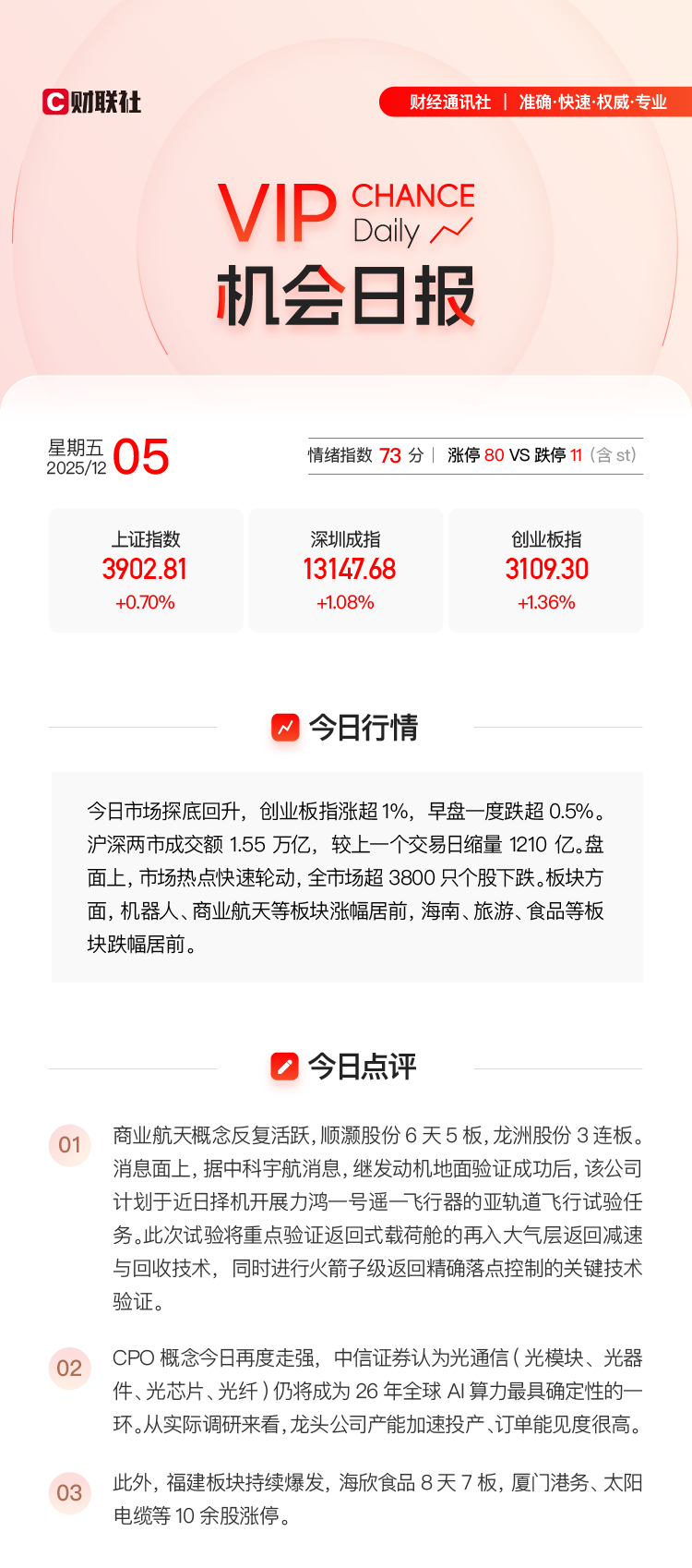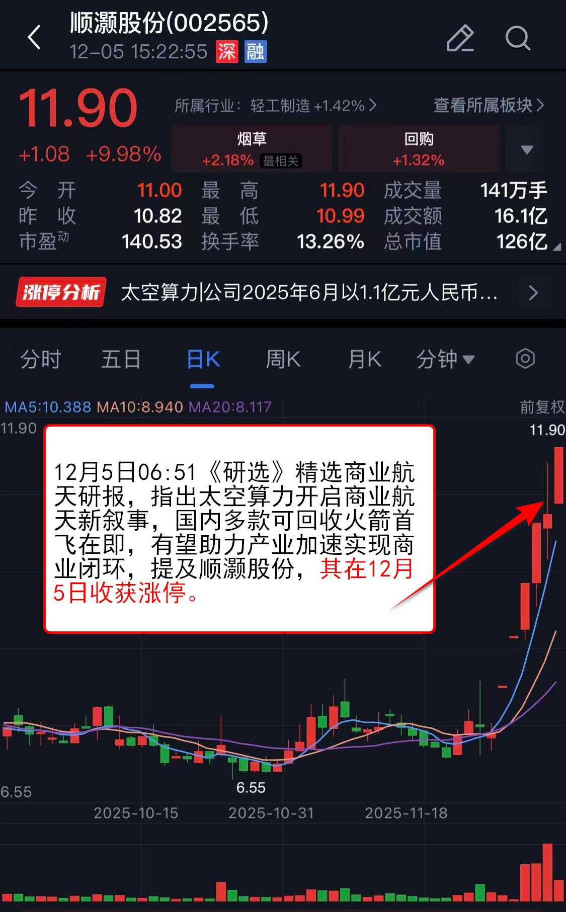 12月5日06:51《研选》精选商业航天研报,指出太空算力开启商业航天新叙事,国内多款可回收火箭首飞在即,有望助力产业加速实现商业闭环,提及顺灏股份,其在12月5日收获涨停。